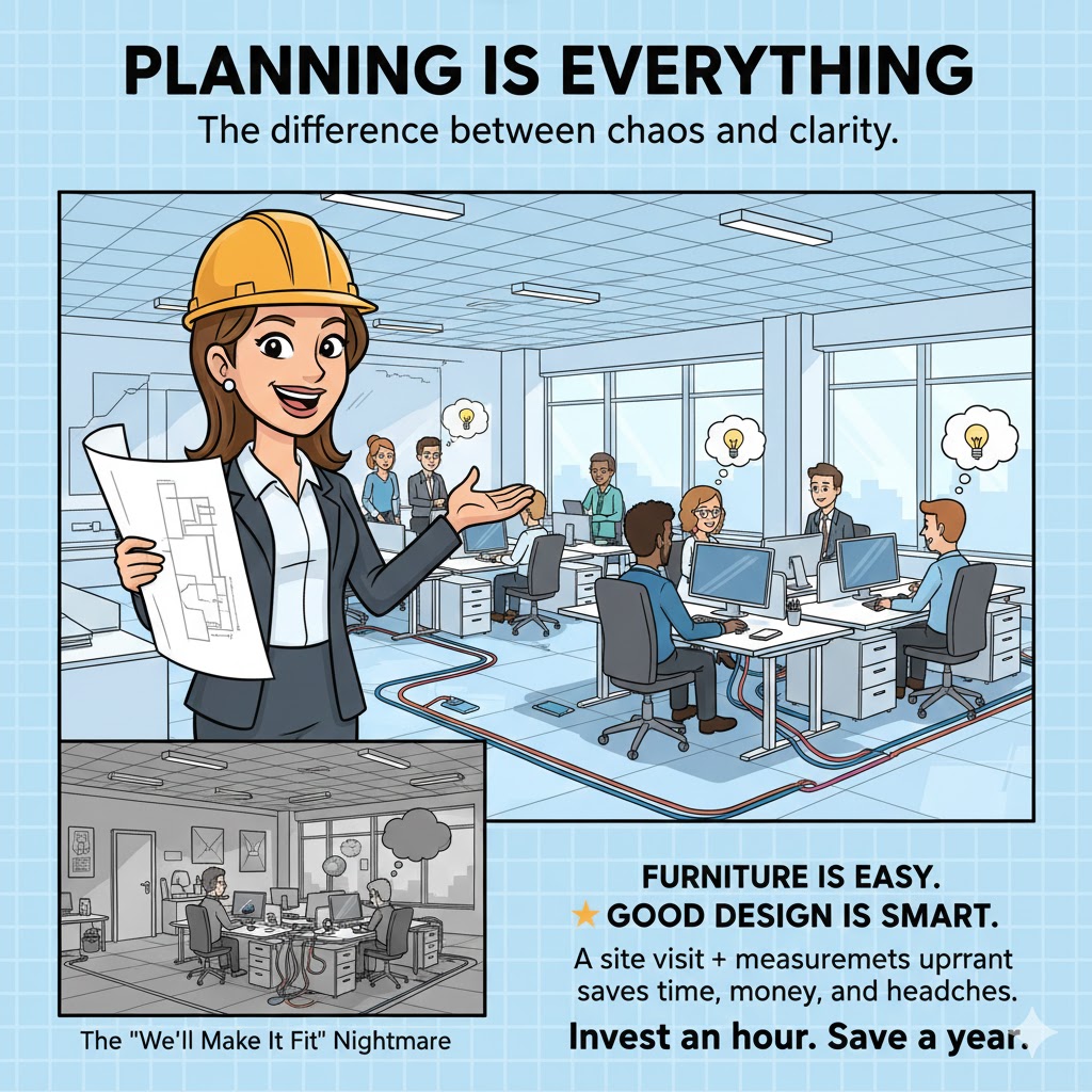 Office Design & Workspace Planning: The “Make It Fit” Trap Optimizing Your Office Furniture Layout through Site Visits We have all heard it. Maybe you’ve even said it: “We’ll make it fit.” On the surface, it sounds resourceful. However, in the world of office furniture, this mindset is a disaster.